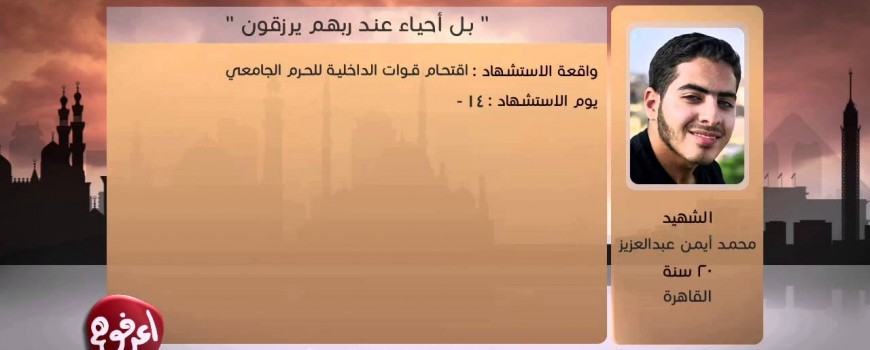 اعرفوهم محمد ايمن عبدالعزيز نشر في 14 مايو، 20143 يوليو، 2015 محمد ايمن عبدالعزيز ضحية جامعة عين شمس 14-5-2014