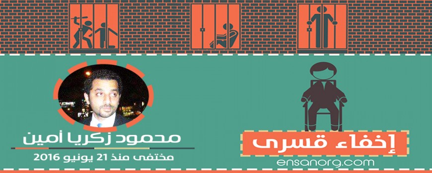 وصلت لمنظمة “إنسان للحقوق والحريات” استغاثة أسرة المواطن “محمود زكريا أمين” 33 سنة – بشأن أخفاء نجلها من قبل الأمن الوطنى وذلك منذ اعتقاله يوم 21 يونيه 2016، حال تواجده بالسايبر الخاص به أسفل منزله، وتم القبض عليه دون إذن من النيابة، ولم يتسنى لأهله أو محاميه معرفة مكان احتجازه حتى الأن .