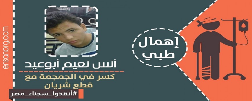 حيثُ أن ” أنس ” مصاب اصابة خطيرة بقنبلة غاز في الرأس من قبل الشرطة المصرية يوم 29 إبريل 2014 ، أدت إلي كسر في الجمجمة مع قطع شريان أجرى على إثرها عدة عمليات جراحية بالرأس، كما يُعانى ” أنس ” المعتقل منذ أكثر من سبعة شهور، من آثار الأصابة في محبسه لغياب الرعاية الطبية و ظروف الحبس الغير آدمية، ويعاني من صداع دائم و فقد القدرة على التركيز مع آلام مستمرة تمنعه من النوم، ومنعت إدارة السجن عنه الأدوية أو المتابعة الطبية اللازمة، الأمر الذي يؤدي إلى تفاقم حالته الصحية وقد يؤدي إلى الموت، منتهكين نص المادة (2) من القواعد النموذجية لمعاملة السجناء بأن على الطبيب أن يقدم تقريرا إلى المدير كلما بدا له أن الصحة الجسدية أو العقلية لسجين ما قد تضررت أو ستتضرر من جراء استمرار سجنه أو من جراء أي ظرف من ظروف هذا السجن، وعلى المدير أن يضع في اعتباره التقارير والنصائح التي يقدمها له الطبيب .