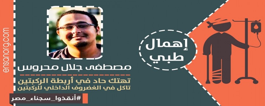 أصيب المعتقل “ مصطفى جلال محروس ” بقطع في الرباط الجانبي للركبة الشمال، وتهتك حاد في الرباط الجانبي للركبة اليمين، مع تآكل في الغضروف الداخلي للركبتين، جراء التعذيب الذى لقاه لمدة سبعة أيام متواصلة خلال فترة إخفائه القسرى من قبل الأمن الوطنى، كما يعانى الطالب من آلام في الفقرة الرابعة والخامسة بالظهر أدت إلى عدم قدرته على المشى أو الحركة.