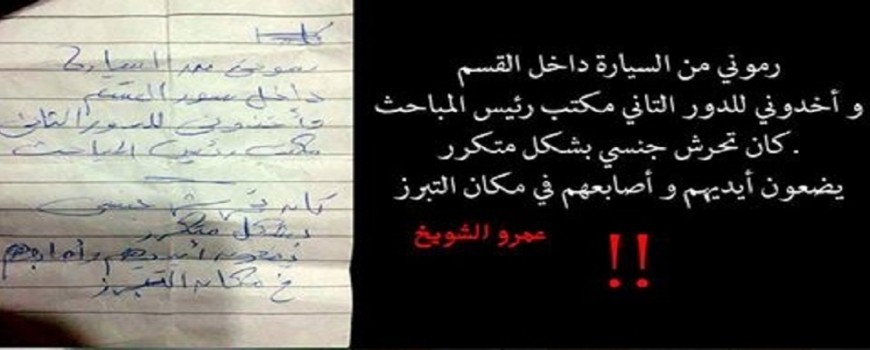 رسالة من الطالب عمر الشويخ نشر في 14 أكتوبر، 201423 يوليو، 2015 رمونى من السيارة داخل القسم وأخدونى للدور التانى مكتب رئيس المباحث كان تحرش جنسى بشكل متكرر .. يضعون أيديهم وأصابعهم فى مكان التبرز عمر الشويخ