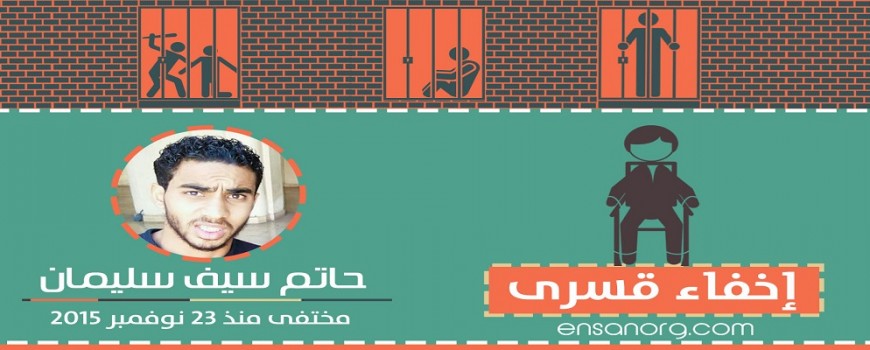 المواطن ” حاتم سيف سليمان ” ، 21 عام ، من سكان ساقية مكي بـ الجيزة ، ، ضحية جديدة من ضحايا الإختفاء القسرى ، تم اختطافه صباح يوم الاثنين الموافق 23 من نوفمر هو مجموعة من اصدقائه من التجمع الخامس بعد عودته من مقر عمله (مندوب باحدي شركات للمستلزمات الطبية) ولم يتم العثور عليهم حتي الان