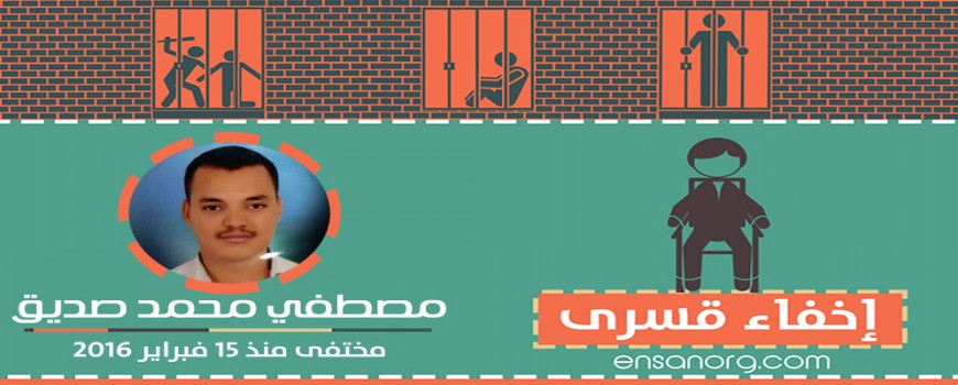 اعتقلت قوات الأمن “مصطفي محمد حسين صديق” الموظف بالشؤن الاجتماعية، تعسفياً ببني سويف من مكتب وكيلة الشؤون الاجتماعية يوم 15 فبراير 2016، تعرض لجريمة الإخفاء القسرى من أول اعتقاله وحتي الآن لم يتم التعرف علي مكان احتجازه أو عرضه علي النيابة.
