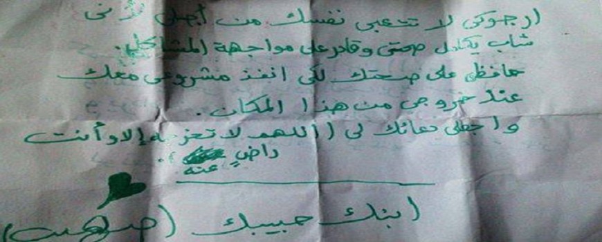 أرجوكي لا تتعبي نفسك لأجلي لأني شاب بكامل صحتي وقادر على مواجهة المشاكل . حافظي على صحتك لكي أنفذ مشروعي معك عند خروجي من هذا المكان. وأجعلى دعائك لي (اللهم لا تخرجه إلا وأنت راض ٍ عنه ) إبنك حبيبك ( صهيب )