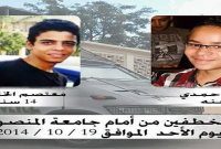 عبد الله حمدى شهيب و معتصم بالله السيد ابراهيم الخاميسى السن : 14 سنة و 15 سنة بالترتيب – في المرحلة الإعدادية من المنصورة – دقهلية تم اختطافهما من قبل قوات الأمن من أمام جامعة المنصورة يوم الأحد 19 أكتوبر 2014م . حرر محضر ضدهما بالتجمهر و قلب نظام الحكم و آثاره الشغب...