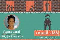 ” أحمد حسين ” طالب مصري بالصف الأول الثانوي التجاري من مواليد 1998 تم إلقاء القبض عليه يوم 3 فبراير 2014 مع 16 شخص ءاخرين من أمام مسجد قرية خروبة بمدينة الشيخ زويد محافظة شمال سيناء حيث تم ترحيله هو و من معه إلى الكتيبة 101 بالعريش و لم يراه أحد بعد...