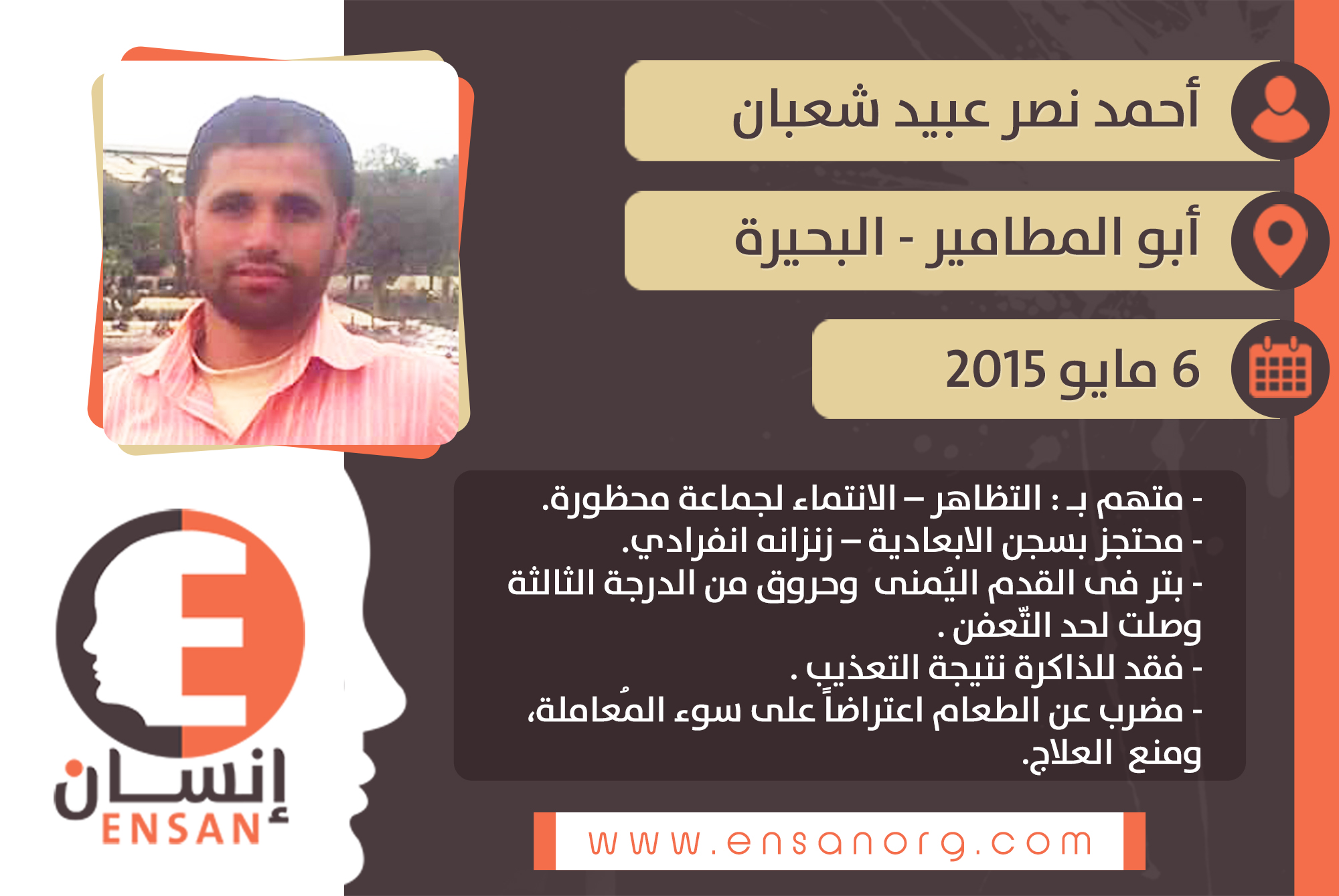 المُعتقل أحمد نصر عبيد شعبان ، يقيم بأبو المطامير بمحافظة البحيرة ، يبلغ من العمر 29 عاماً ، يعمل كمحاسب لدى إحدى الشركات ، تمَّ اعتقاله تعسفياً في 6 مايو 2015 ، وذلك أثناء تواجده بمستشفى الجامعة لتلقي الإسعافات اللازمة جرّاء إصابته البالغة في حادث سير كان قد تعرّض له . وهذا الإعتقال تمّ دون سابق إذن من أي جهة قضائية وهو ما يُنافي المادة 54 من الدستور المصري : لا يجوز القبض على أحد، أو تفتيشه، أو حبسه، أو تقييد حريته بأي قيد إلا بأمر قضائي مسبب يستلزمه التحقيق. وكذلك نص الماده 9 من الإعلان العالميّ لحقوق الانسان .