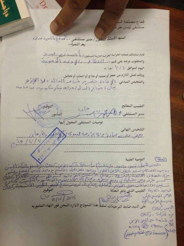 ويُكمـل قائلاً : “أنا مسجون فى سجن دمنهور العمومى بعد ما قُبض عليا من مستشفى إسكندرية الجامعى، في شهر مايو2015 تم ترحيلى إلى سجن طره يوم 8/10/2015 علشان أتعالج فى مستشفى السجن وتم عرضى على مستشفى القصر العينى لأن مستشفى دمنهور مفيهاش جراحة ميكروسكوبية تناسب حالتى .. ومن يومها وأقر أطباء القصر العينى انى محتاج تدخل جراحى بس بعد ما اعمل علاج طبيعى ومن يومها وانا محتار ومتمرمط بين سجن دمنهور وطره وكل شوية يرحلونى فى عربية لورى بتموتنى وبشوف فيها ألوان العذاب وبعدين يرجعونى طره ويعرضونى على القصر العينى فى مواعيد غير المحددة لى والقصر العينى يرجعنى تانى بمواعيد جديدة والسجن مش يوافق يخرجنى بسبب رفض أمن الدولة ” . ونص الرساله بخط يده مُرفق بالتقرير .