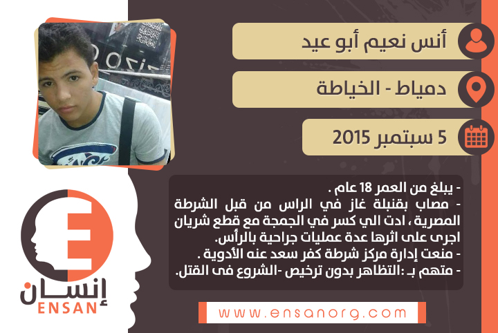 حيث ُ تلقت منظمة “إنسان للحقوق والحريات” نداء استغاثة من أسرة الطالب ” أنس نعيم أبوعيد ” البالغ من العمر ثمانية عشر عاماً ، وهو طالب بالمرحلة الثانوية العامة , يقيم بقرية بالخياطة التابعة لمحافظة دمياط، تم اعتقاله تعسفياً فى الخامس من شهر سبتمبر 2015 الماضي . حيثُ أعربت الأسرة عن مخاوفها بشأن تردى الحالة الصحية للطالب بمقر احتجازه بمركز شرطة كفر سعد بمحافظة دمياط.