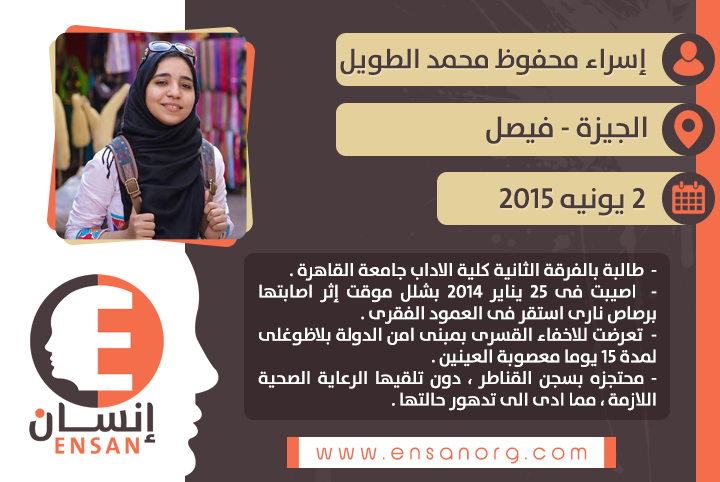 خمسةَ عشرَ يوماً من الاختفاءِ القسريّ داخلَ ما يُعرف بنيابةِ أمن الدولة العليا بلاظوغلى في القاهرة قضتها الطالبة ” إسراء محفوظ محمد الطويل ” هناك ، إسراء تم اختطافها وإخفائها قسرياً في الأول من يونيو لعام 2015م من أمام مطعم تشيلز فيصل بالجيزة. تبلغ من العمر23عاماً ، من مواليد الثامن والعشرين من شهر يونيو لعام 1992م ، تحمل بطاقة هوية برقم قوميّ 29206880056 ، وتقيم بشارع المساكن – حي فيصل – محافظة الجيزة ، تدرس الطالبة عامها الثاني بكلية الآداب جامعة القاهرة .