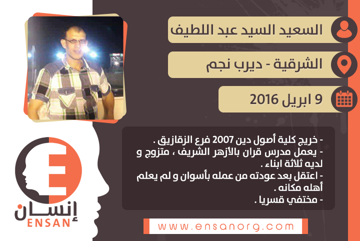 حيث تلقت منظمة “انسان للحقوق الحريات” يوم 19 إبريل 2016 شكوي من زوجة المواطن “السعيد السيد عبداللطيف” من قرية – الهوابر لمركز ديرب نجم بمحافظة الشرقية يبلغ من السن 32، وهو خريج كلية أصول الدين – الزقازيق 2007م يعمل مدرس قرآن بالأزهر الشريف، متزوج ولديه ثلاثة أبناء: محمد (5 سنين) – آية (سنتين) – معاذ (شهرين).