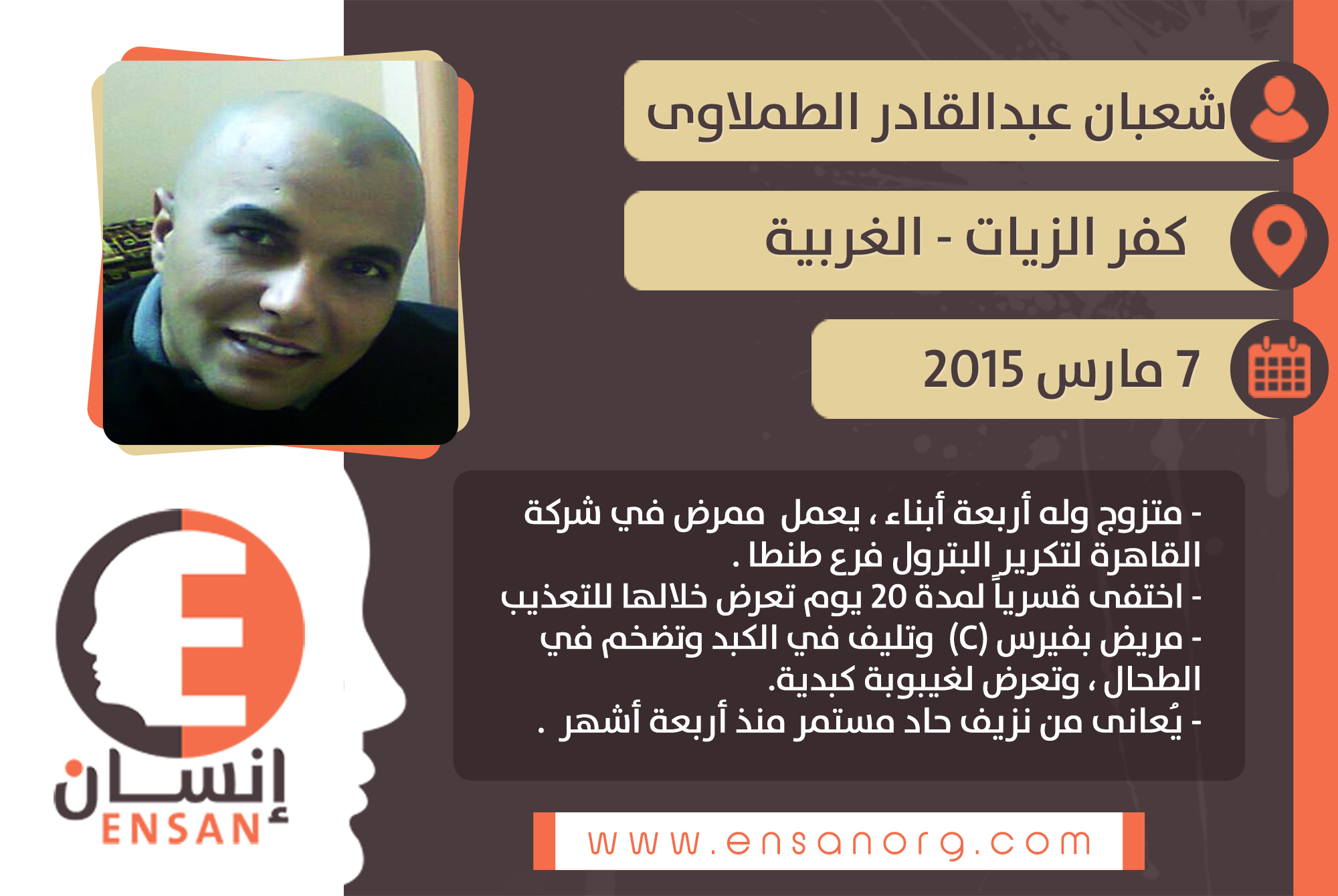 وبالتواصل مع زوجة المعتقل علمت ” إنسان ” أن المعتقل ” شعبان عبد القادر رضوان الطملاوي ” البالغ من العمر 36 سنة ، العائل الوحيد لأسرته المكونة من أربعة أبناء وزوجته ، يقيم بمدينة كفر الزيات بمحافظة الغربية ، يعمل ممرض في شركة القاهرة لتكرير البترول فرع طنطا بمحافظة الغربية ، تم اختطافه يوم 7 من مارس 2015 واخفاءه قسرياً لمدة تزيد عن 20 يوم ،تعرض خلالها للتعذيب الشديد لإجباره علي الاعتراف بجرائم لم يرتكبها ، مما أدي لتدهور حالته الصحية ، وقررت نيابة أمن الدولة العليا بالقاهرة حبس المختطف “شعبان الطملاوي” بتهم مستحدثة وهي “تأسيس جماعات نوعية – تفجيرات – التحريض على أعمال الشغب والعنف”.