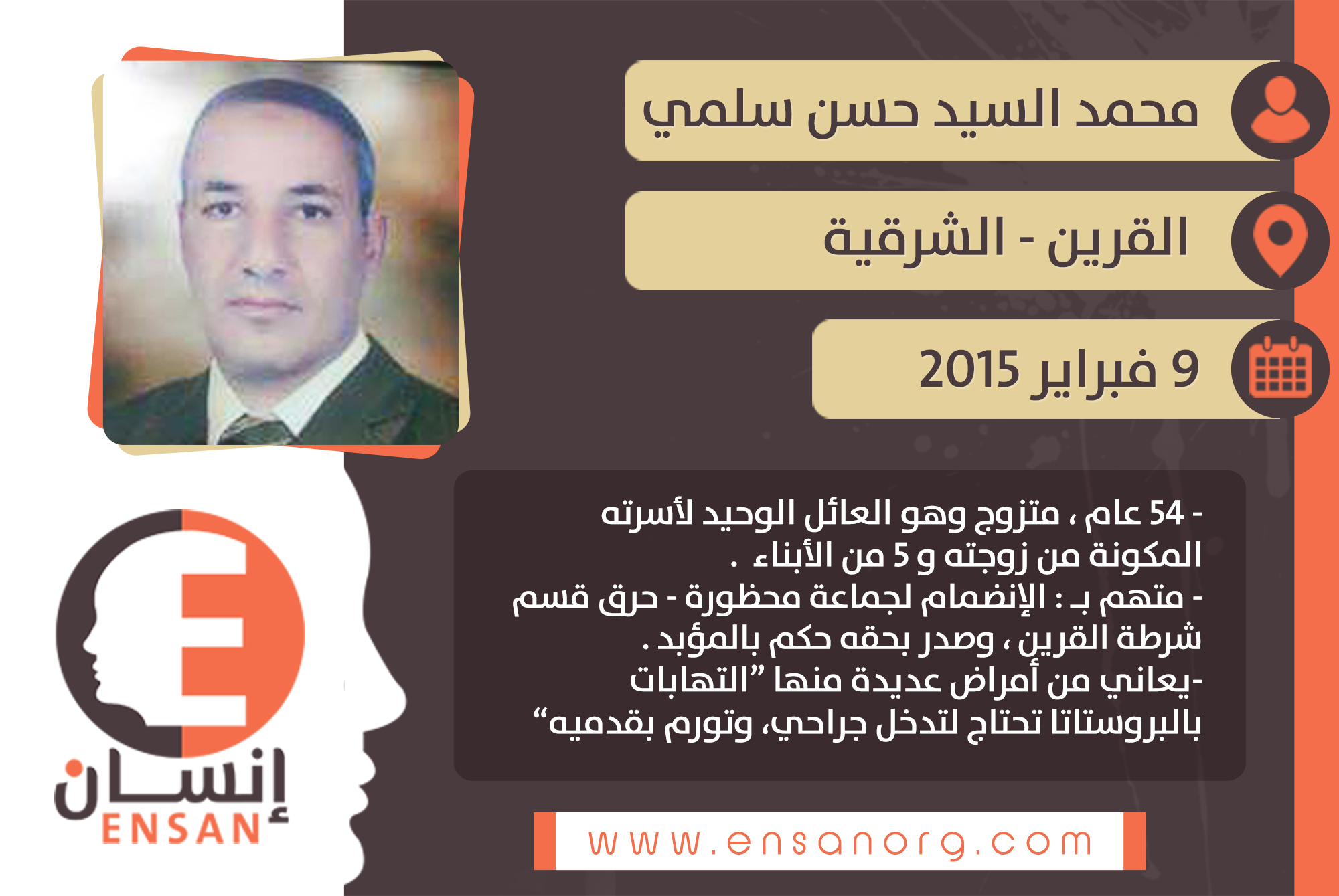 تلقت منظمة إنسان للحقوق والحريات شكوى من أسرة المعتقل ” محمد السيد حسن علي سلمي ” والشهير بـ غريب سلمي البالغ من العمر 54 عاما المقيم في مدينة القرين بمحافظة الشرقية متزوج وهو العائل الوحيد لأسرته المكونة من زوجته و 5 من الأبناء أنه تم القاء القبض على زوجها الطاعن في السن وتعرضه لاهمال صحي قد يؤدي بحياته.