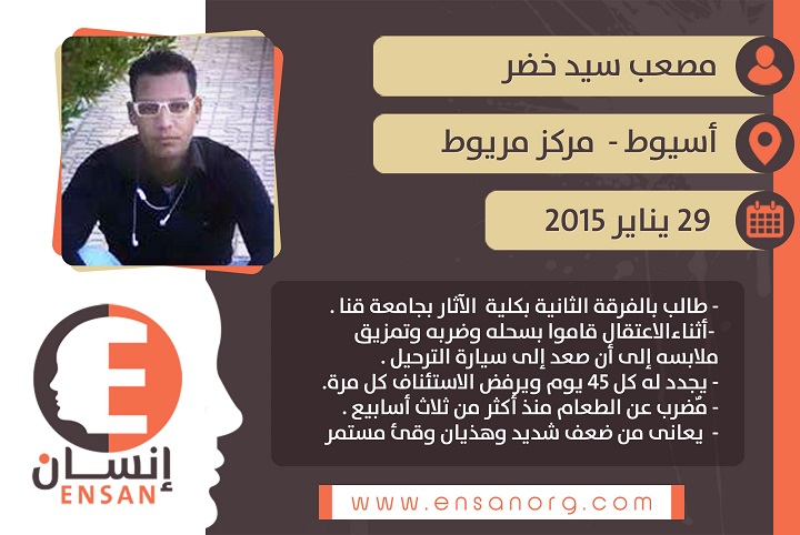 تلقت منظمة إنسان للحقوق والحريات شكوى من أهل المعتقل مصعب خضر معبرة عن قلقها عليه بسبب تدهور حالته الصحية بعد إعلان إضرابه عن الطعام ، حيث علمت المنظمة من أسرته أنه قد تم اعتقال ” مصعب سيد خضر ” الطالب بالفرقة الثانية بكلية الآثار بجامعة قنا من مركز مريوط بمحافظة اسيوط مساءً يوم الخميس 29 يناير 2015 وموجود حاليا بسجن ( مركز ديروط ) بعد اعتقال أخيه الأكبر صهيب بدقائق حيث عادت قوات الأمن مرة ثانية لتقي القبض على مصعب وأخيه الصغير محمد بدون إي تهم أو سبب وقاموا بسحلهم وضربهم وتمزيق ملابسهم واعتقلوهم حافيا الأرجل عرايا إلى أن صعدوا إلى سيارة الترحيل ومنذ 9 أشهر إلي الآن ويجدد لهم كل مرة بــ 45 يوم ويرفض الاستئناف في كل مرة.