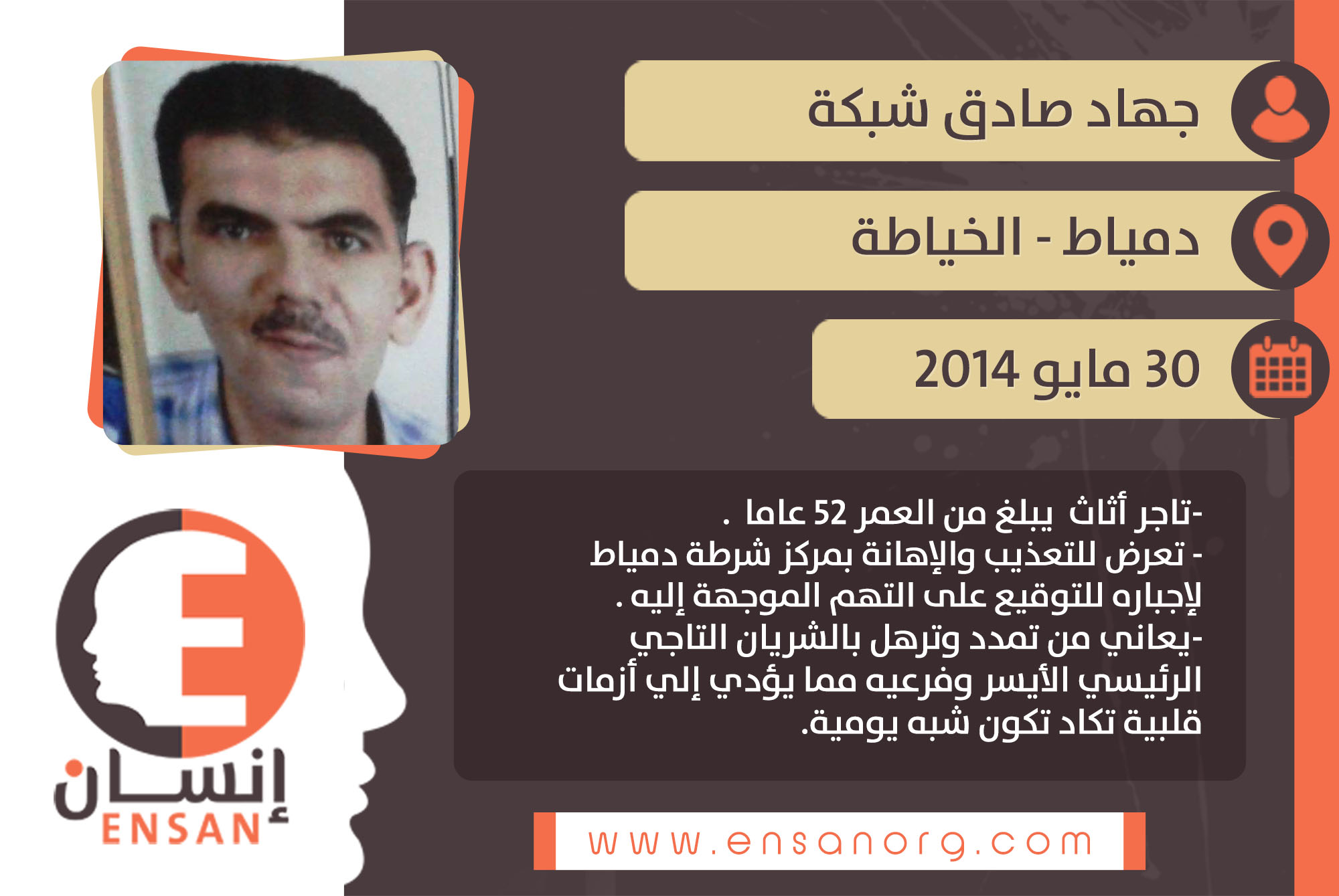 فقد تلقت المنظمة نداء استغاثة عاجل من أسرة تاجر الأثاث جهاد صادق شبكة المقيم بقرية الخياطة محافظة دمياط البالغ من العمر 52 عاما بأنه أثناء خروجه من أحد مساجد القرية بعد أداء شعائر صلاة الجمعة يوم 30 مايو 2014م تصادف مع فض مسيره مناهضة للنظام الحالي واعتقل الحاج جهاد، وتؤكد أسرته أن ليس لديه أي نشاط أو انتماء سياسي ورغم ذلك تعرض للتعذيب والإهانة في مركز شرطة دمياط للإجبار علي التوقيع علي المحضر الموجه له واتهامه بالتظاهر وتذكر أسرته في استغاثتها أنه معتقل حاليا سجن جمصة العمومى ويتم التأجيل له في قضيته دون صدور حكم ضده ما يقرب من عام ونصف.